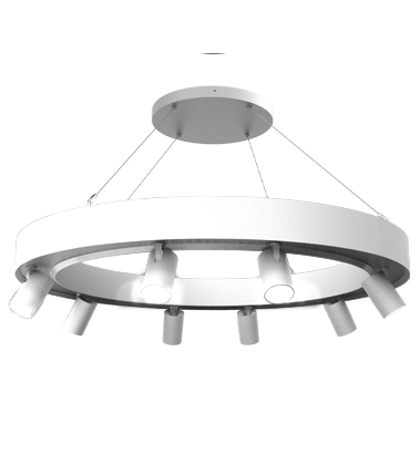 Abgehängte Beleuchtungsstruktur in kreisförmigem Format mit dekorativen Hochleistungsstrahlern mit CRI>90, die speziell für Orte entwickelt wurde, an denen die Beleuchtung mit einem Radius von 360º fokussiert werden soll. Diese gewagte und einzigartige Leuchte ist perfekt für Einzelhandels- und/oder Transitbereiche.
