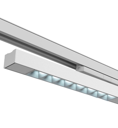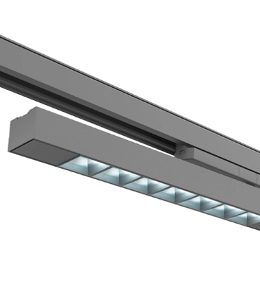 Dekorative lineare LED-Direktlichtleuchte für dreiphasige Stromschienen mit Hochleistungsoptik und sehr niedrigem Blendungsindex (UGR<16). Gehäuse aus hochwertigem stranggepresstem Aluminium mit einbrennlackierter und strukturierter Oberfläche.