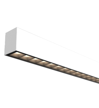 Lineare Leuchte mit direktem und indirektem Licht, die einen oberen opalen Diffusor mit einer Hochleistungsoptik (UGR<17) im unteren Teil der Leuchte kombiniert. Dieses Modell ist völlig linear, wobei die Optik die gesamte Leuchte einnimmt.