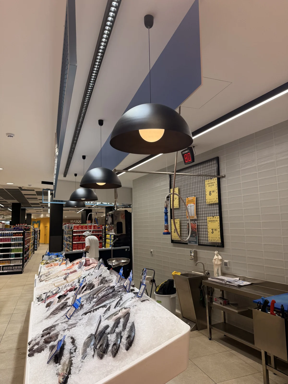In specific sections such as the butcher's and fishmonger's, a system of linear luminaires with special colour optics has been implemented, optimising the presentation of fresh produce. This development is complemented by customised suspended canopies that reinforce the lighting in these areas, improving the visual perception of the food and creating an attractive environment for customers.