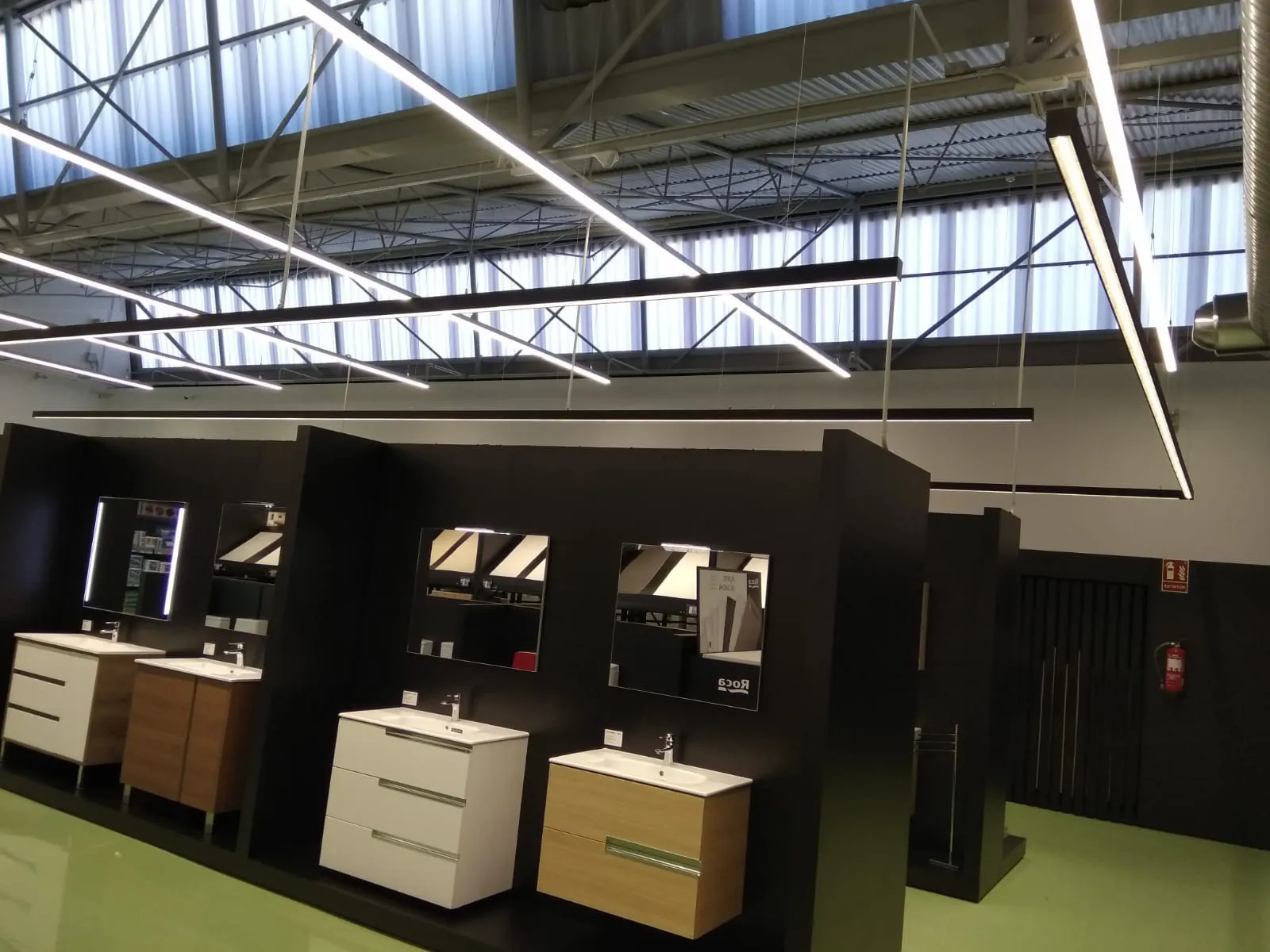 El proyecto de iluminación que realizamos para este showroom en Madrid se centró en la implementación de un sistema de iluminación moderno y eficiente, diseñado para maximizar tanto la funcionalidad como la estética del espacio. Optamos por el uso de luminarias lineales suspendidas LED, una solución que ofrece una iluminación brillante y uniforme, ideal para resaltar los productos sin crear reflejos molestos o sombras no deseadas.